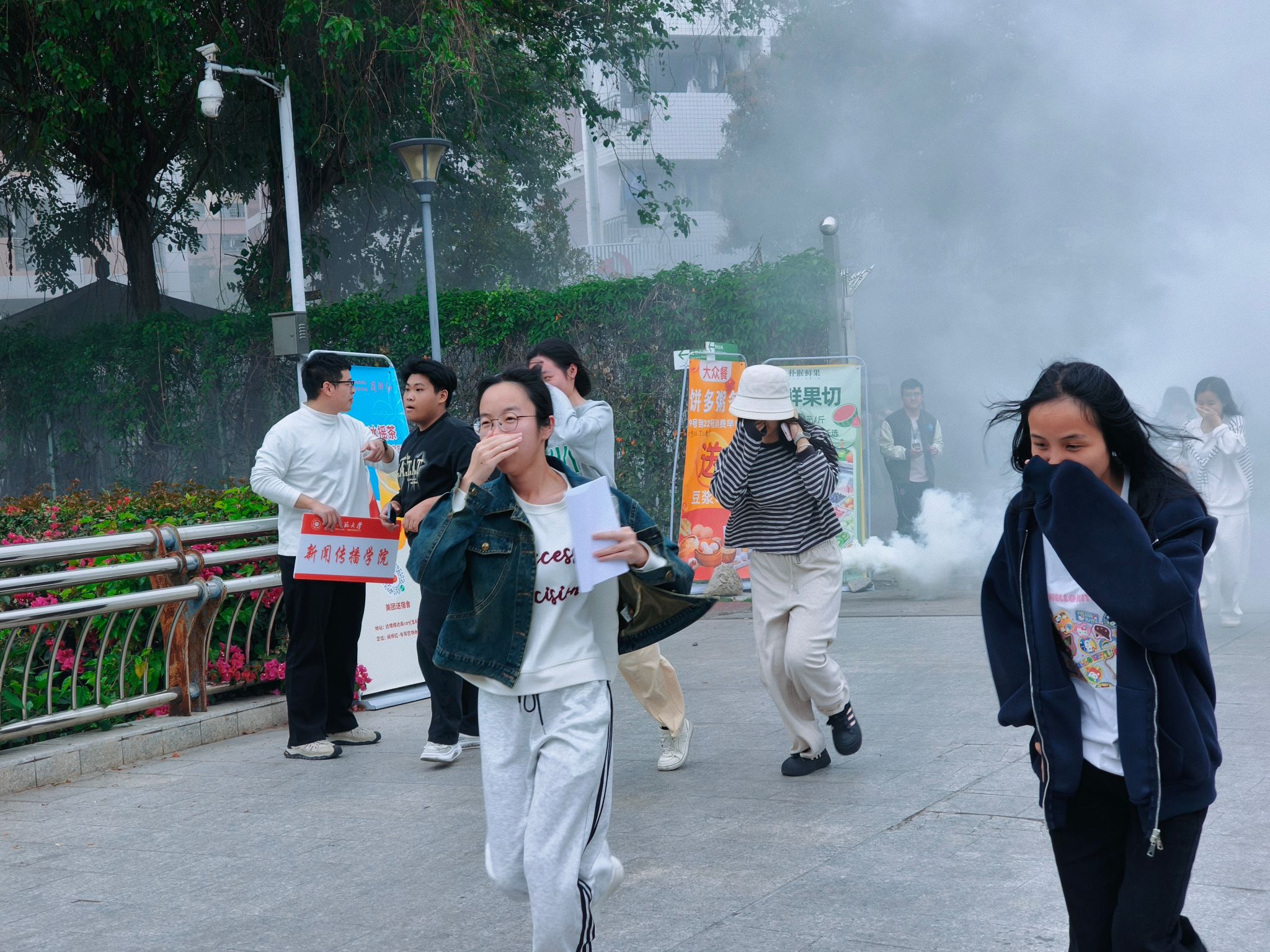 演练前期,学院提前统筹部署,规划演练时间和疏散路线。完成各项准备活动后,下午时分,演练正式开始,达理学生社区率先响起火警警报,待该社区学生安全撤离完毕后,瑞京学生社区警报随后启动。警报响起期间,社区公寓内消防烟雾装置同步开启,模拟真实的火灾场景。