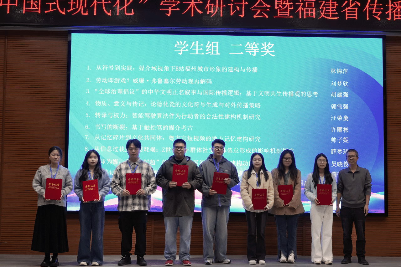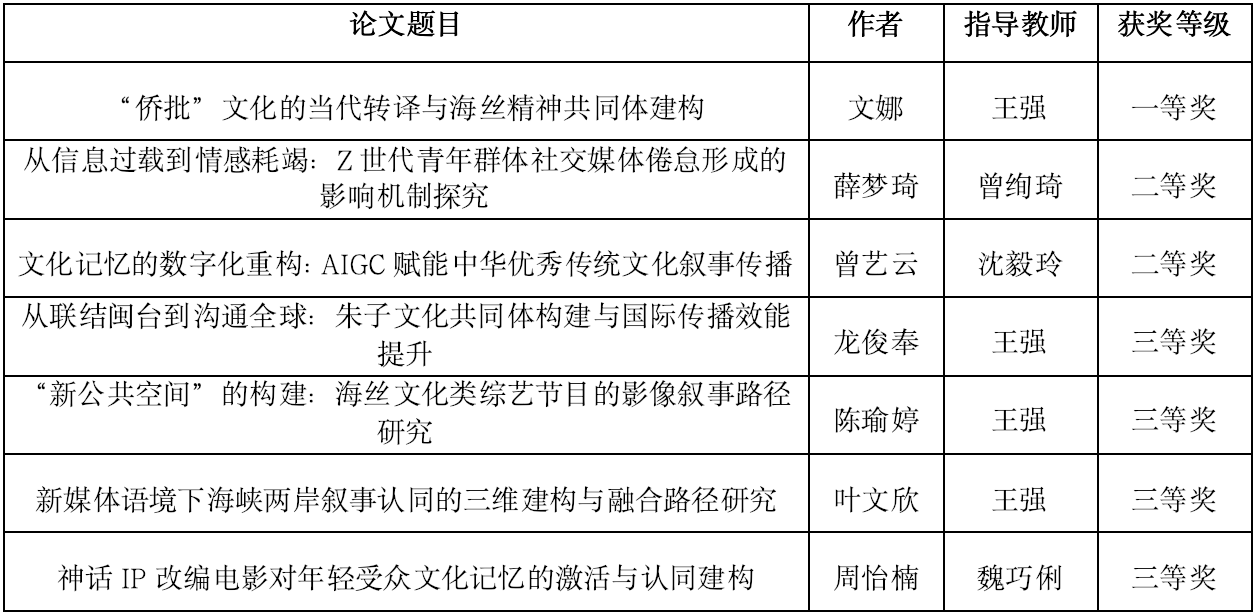 我院高度重视此次学术交流契机,积极组织研究生投稿参与,将其作为提升研究生学术素养、拓展科研视野的重要平台。在会议设置的“青年学者学术论文奖暨海丝国际传播实践研究论文奖”评选中,我院学子表现优异,共斩获7项优秀论文奖,其中一等奖1项、二等奖2项、三等奖4项,充分展现了我院研究生在文化传播研究领域的扎实功底与创新潜力。