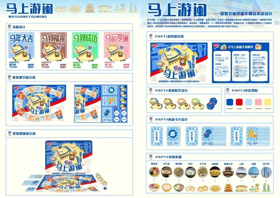 很高兴我们的作品《马上游闽》能在学院奖中荣获银鹭周边设计银奖。我们最初的想法很简单:如何让“游闽饿不慌,马上喝银鹭”这句口号,变成大家可以一起感受和互动的体验。于是,我们尝试把福建的风物融入桌游设计,让一语双关的“马上”的意象化为赛马机制,让品牌自然地成为游戏中的能量补给环节。