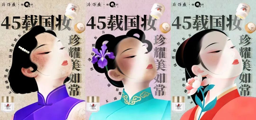 以“国妆传承与东方美韵”为核心,以插画形式分别呈现古代、民国、现代三个时期的东方女性形象,统一强化“45载国妆 珍耀美如常”的主题与产品露出,同时以服饰、花卉、肌肤状态的细节差异,串联品牌从古方到现代的传承创新线,用传统美学与现代设计的融合,传递片仔癀皇后珍珠膏作为“东方美传承载体”的文化价值与功效价值。