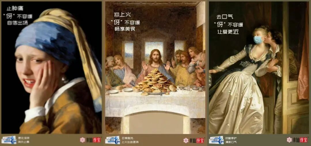 以“经典名画+当代口腔痛点”的反差萌为核心,把严肃名画场景和年轻人的口腔困扰(熬夜上火、美食后肿痛、约会口气等)结合,用“名画人物也有牙烦恼”的趣味设定:让《戴珍珠耳环的少女》捂腮皱眉(对应牙龈肿痛)、《偷吻》情侣约会戴口罩(对应口气尴尬)、《最后的晚餐》堆满美食却有人摆手拒绝美食(对应上火出血),让经典品牌跳出“老派”标签,贴近年轻群体的生活共鸣:用“‘伢’不容缓”的谐音梗串起“消炎止痛、抑火去口气”的产品功效,借名画的经典感锚定品牌“匠心制药”的专业底色,又以反差萌消解老派感——让经典良药变年轻救场神器,传递“牙”不容缓的共鸣。