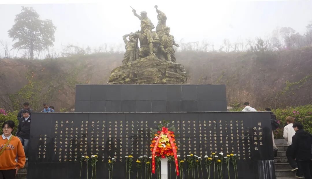 随后,全体人员来到靖和浦苏区保卫战纪念碑前,庄严肃立,举行敬献花圈、鞠躬默哀仪式。学院党委班子代表全体教职工向革命先烈敬献花篮,全体人员三鞠躬并默哀,深切悼念在靖和浦苏区保卫战中英勇牺牲的革命烈士。纪念碑上镌刻的红色印记,仿佛诉说着当年苏区军民浴血奋战、舍生取义的壮烈史诗。大家纷纷表示,要永远铭记先烈功绩,珍惜来之不易的和平盛世,把对先烈的崇敬之情转化为立德树人、干事创业的强大动力。