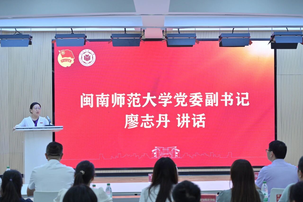 校党委副书记廖志丹在仪式上讲话。她指出,“青春领航·拔尖赋能”帮扶附属中学拔尖创新人才培养志愿服务专项活动既是对协同办学成果的深化,更是我校志愿服务工作向专业化教育服务领域延伸的有益探索。她对志愿者提出三点希望,一是要做“有心的启蒙者”,带着专业知识走进课堂,带着共情之心贴近附属中学高三学生,用理解与尊重搭建起心与心的桥梁;二是要做“有法的引导者”,既要当好“知识传递者”,更要当好“方法引路者”,让学习不仅“有用”,更充满“挑战”与“成长感”;三是要做“有情的陪伴者”,以严谨的态度做好学业辅导,用青春的热情传递温暖力量,成为附属中学高三学生值得信赖的“同行人”,用实际行动诠释“奉献、友爱、互助、进步”的志愿精神,展现闽南师大学子的青春风采。